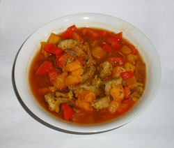 | Zubereitung | Schinkengulasch in ein Wasserbad geben und so lange kochen bis das Fleisch spröde ist. Nach der hälfte des Kochvorgangs die Kartoffeln dazu geben. Anschließend die Zwiebeln, Paprika und das Tomatenmark. Während des Kochens des öfteren umrühren um ein anbrennen zu vermeiden. Zum Schluss mit Salz, Pfeffer, Paprika und Kümmel abschmecken. | ||||||||||