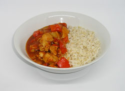 | Zubereitung | Den Reis im Wasserbad solange kochen, bis er sich voll gesogen hat. Dann das überschüssige Wasser abgießen und den Reis salzen. Jetzt die Hähnchenbrust anbraten bis sie durch ist und aus der Pfanne nehmen und in mundgroße Stücke zerschneiden. Die Hähnchenstücke nun knusprig braten bis sie braun sind. Anschließend die Zwiebeln dazu geben und solange braten bis sie goldbraun sind. Nach und nach die klein geschnittenen Paprika, die Bambussprossen, die Erdnüsse und das Tomatenmark hinzugeben. Für die Soße noch etwas Wasser dazu gießen und mit Guarkernmehl binden. Zum Schluss noch mit Salz, Pfeffer, Süßstoff und Zitronensaft abschmecken. | ||||||||||||||||