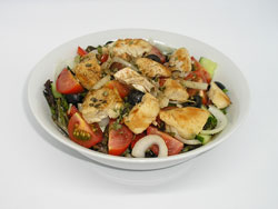 | Zubereitung | Hähnchenbrust in der Pfanne anbraten, in kleine Stücke schneiden und diese von allen Seiten goldgelb braten. Salat, Salatgurke, Paprika, Tomate, Zwiebel und Oliven in mundgerechte Stücke schneiden und der Reihe nach in die Schüssel geben. Die Hähnchenbrust obendrauf legen und mit Salz, Pfeffer und Paprika würzen. Anschließend getrocknete Bärlauchblätter drüber streuen und mit Balsamico-Essig beträufeln. | ||||||||||||||||