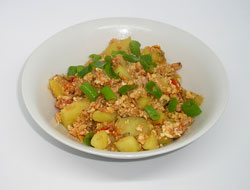| Zubereitung | Die Kartoffeln im Wasserbad kochen, bis sie gar sind. Den Schinken in der Pfanne anbraten und die Kartoffeln klein geschnitten dazu geben. Wenn die Kartoffeln goldgelb sind die klein geschnittenen Tomaten dazu geben und solange braten bis die Flüssigkeit verkocht ist. Anschließend die Eier dazu geben und mit Salz, Pfeffer und Paprika würzen sowie mit Lauchzwiebeln bestreuen. | ||||||||||
